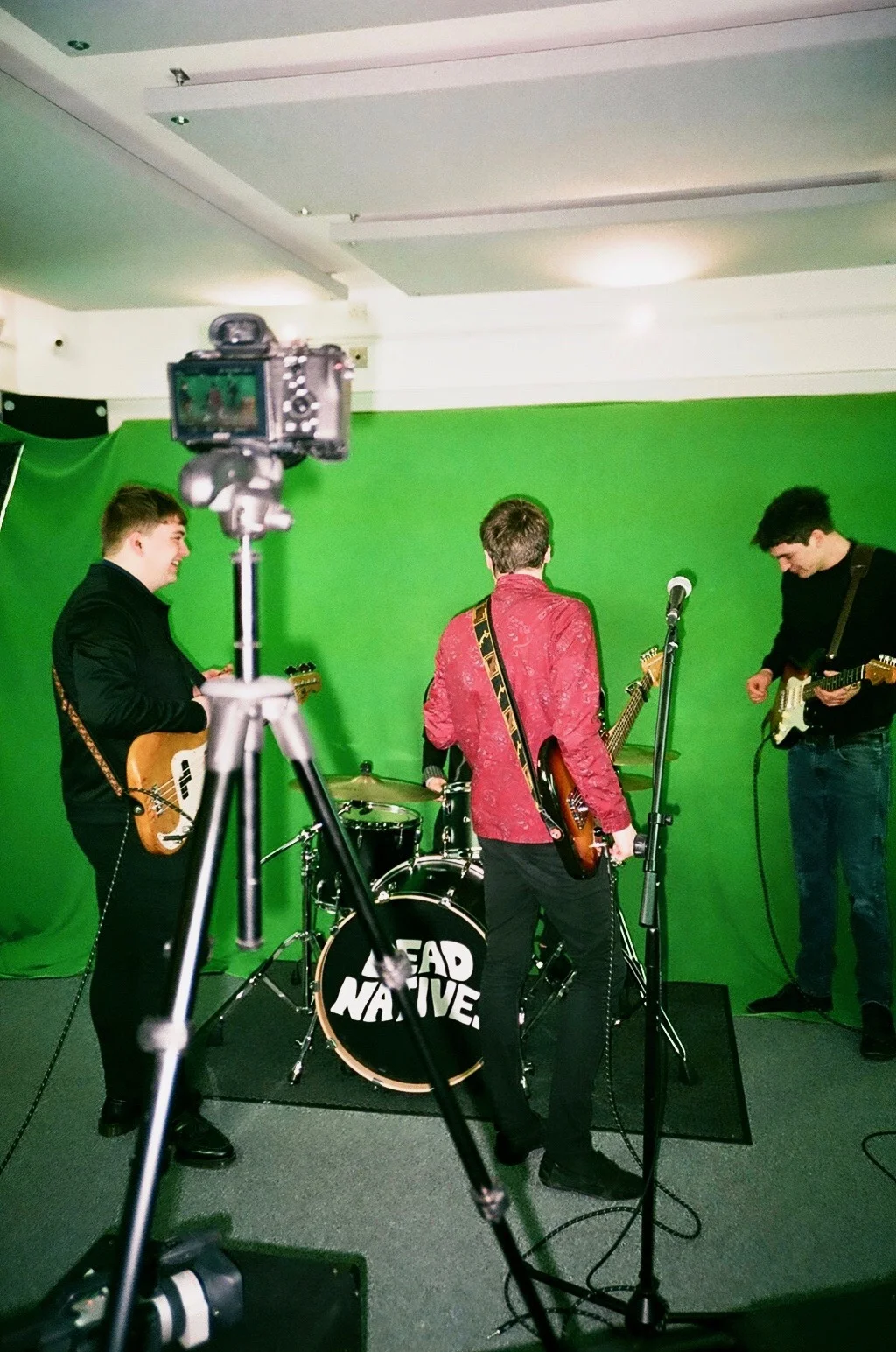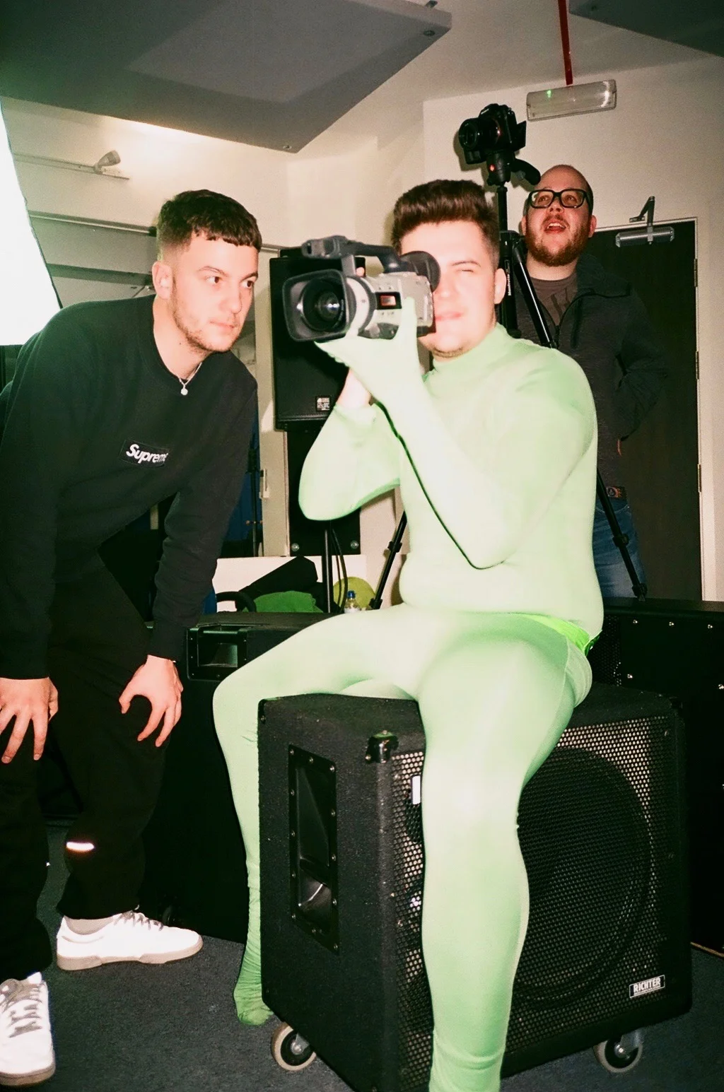 When filming came around, we locked off in beautifully crisp 4K, so we could crop and tuck wherever we needed to. We had the boys on a green screen at all time, from ceiling to floor which is where Loveless (wearing a green screen suit) came in. Walking around the boys with his dad’s old MiniDV camera, we captured a more dynamic set of shots. The MiniDV picked up the green screen too, which is where the trippy 90's inspired background animations came into play. It was with this concoction of shops that provided the trippy nostalgia mess that we strived for.